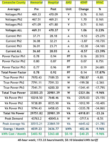 ELECTROGENX4-PCU effects KVA reduction, kWh consumption and load demand in addition to TVSS (transient voltage surge suppression). It typically yields post installation real kilowatt 8% - 15% savings in equipment such as the Air Handler Unit (AHU) above.