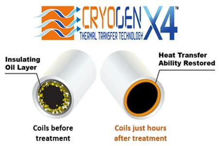 First, you can spend thousands of dollars to replace your existing commercial HVAC systems with new, higher efficiency units, which is what the HVAC equipment manufacturers count on you to do over and over again. The other option is to only spend a fraction of the unit-replacement costs on the best proven efficiency restoration solutions — CryogenX4-TTT and CryogenX4-ACT. Both products are specifically designed to enhance the overall performance of any HVAC equipment without modification or alteration. In addition to restoring cooling capacity by removing the majority of oil fouling (fig.2), these fourth-generation nanotechnologies help reduce HVAC run-time by removing humidity faster and cooling the air quicker. Best of all, any HVAC equipment treated with the CryogenX4 products are covered by Tri-S Corporation’s million-dollar lifetime warranty.